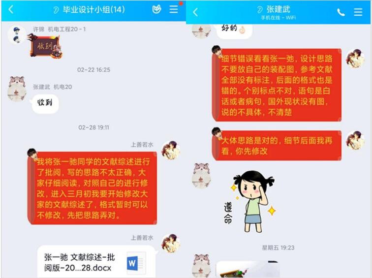 “同学们,大家的设计说明书要抓紧时间撰写核心部分了……”胡灿老师在钉钉发起视频会议。“王老师,我把文献综述写好了,您看看有什么地方需要修改吗?”王海明老师手机QQ收到了学生发来的信息。疫情防控阶段,这种线上指导几乎每天都在开展。同学们定期把自己的设计学习进度和成果向老师汇报,老师们对同学们提出的问题耐心解答。