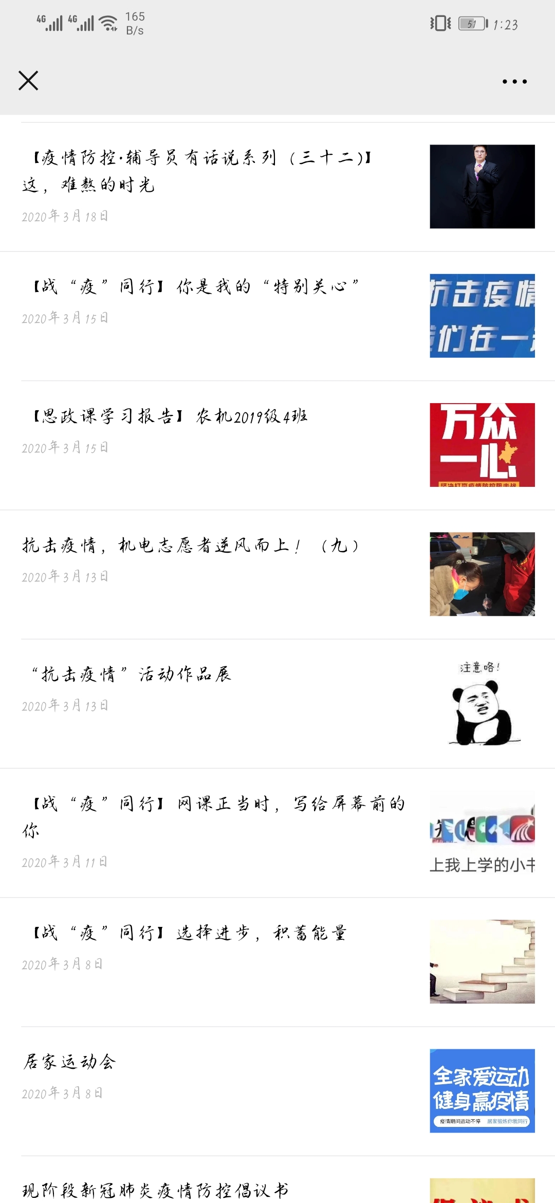 学院召开班长、团支书线上会议,增强责任感,规范学生干部的工作作风。提升综合测评,学生党支部开展主题党日活动,提高思想认识,发挥党员先锋模范作用。全体团支部开展“战役有我,青春同行”线上主题团日活动,引导各班级开展防疫知识学习、榜样力量宣传、志愿行动等。“机电微映象”微信公众号以“战疫同行”、“胡杨精神”、“抗击疫情、机电志愿者逆风而上”等系列推送,同学们积极参与各种线上学习、体育活动,全员参加全国大学生共上一堂思政课,递交感受体会等2300余份。展现出机电学子积极乐观、认真好学的精神面貌,坚定了学生抗击疫情的信心和认真学好网课的决心。