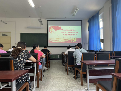 工程基础系—办公室教工联合党支部书记孔德国从党史发展脉络及学习意义;100年艰辛与辉煌;光明的使者、幸福的源泉、锻造维护核心对党忠诚的坚定信念;学党史心得体会等四个方面向大家全面系统的讲述了中国共产党的光辉历史。