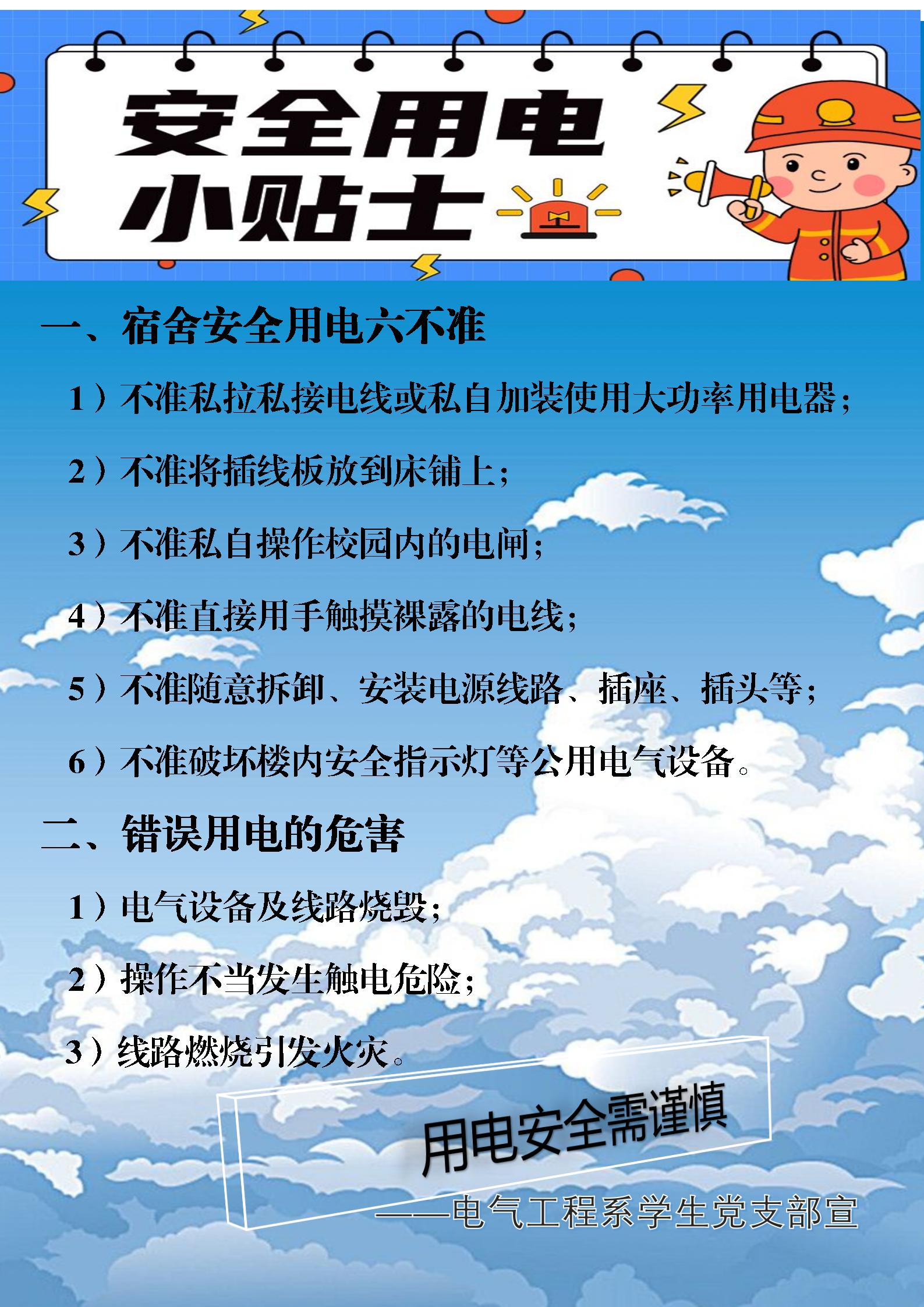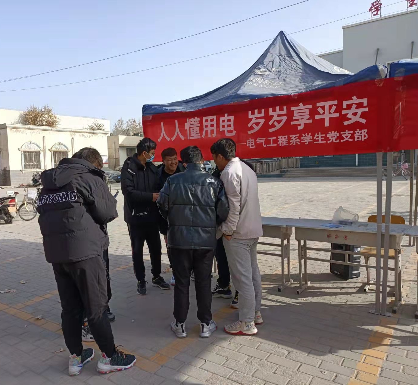 为积极营造和谐、安全、健康的宿舍环境,加强学生生活用电基本常识,11月24日,电气工程系学生党支部开展以“我为群众办实事·用电安全宣讲”为主题的活动。活动在四号食堂门前和学院学生宿舍楼开展。
