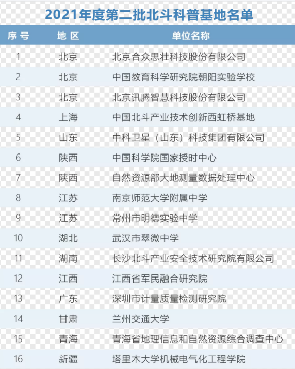 2021年12月14日,中国卫星导航系统管理办公室学术交流中心对2021年度全国第二批北斗科普基地名单进行了公示: