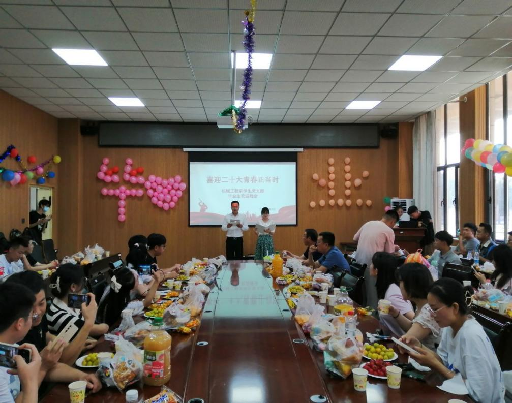 6月2日晚上,机械工程系学生党支部开展了以“青春二十大 喜迎正当时”为主题的毕业生党员欢送会暨集体政治生日会,学院党委副书记、院长王旭峰,副院长张宏,机械工程系党总支书记廖结安,机械工程系学生党支部书记赵澳,大四毕业生共同参加此次活动,并为毕业生党员送上最真诚的祝福。活动在东扩区D108会议室进行。