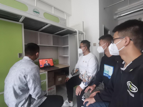 在校生以宿舍为单位在学生公寓内收看党的二十大直播盛况。