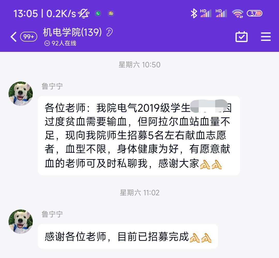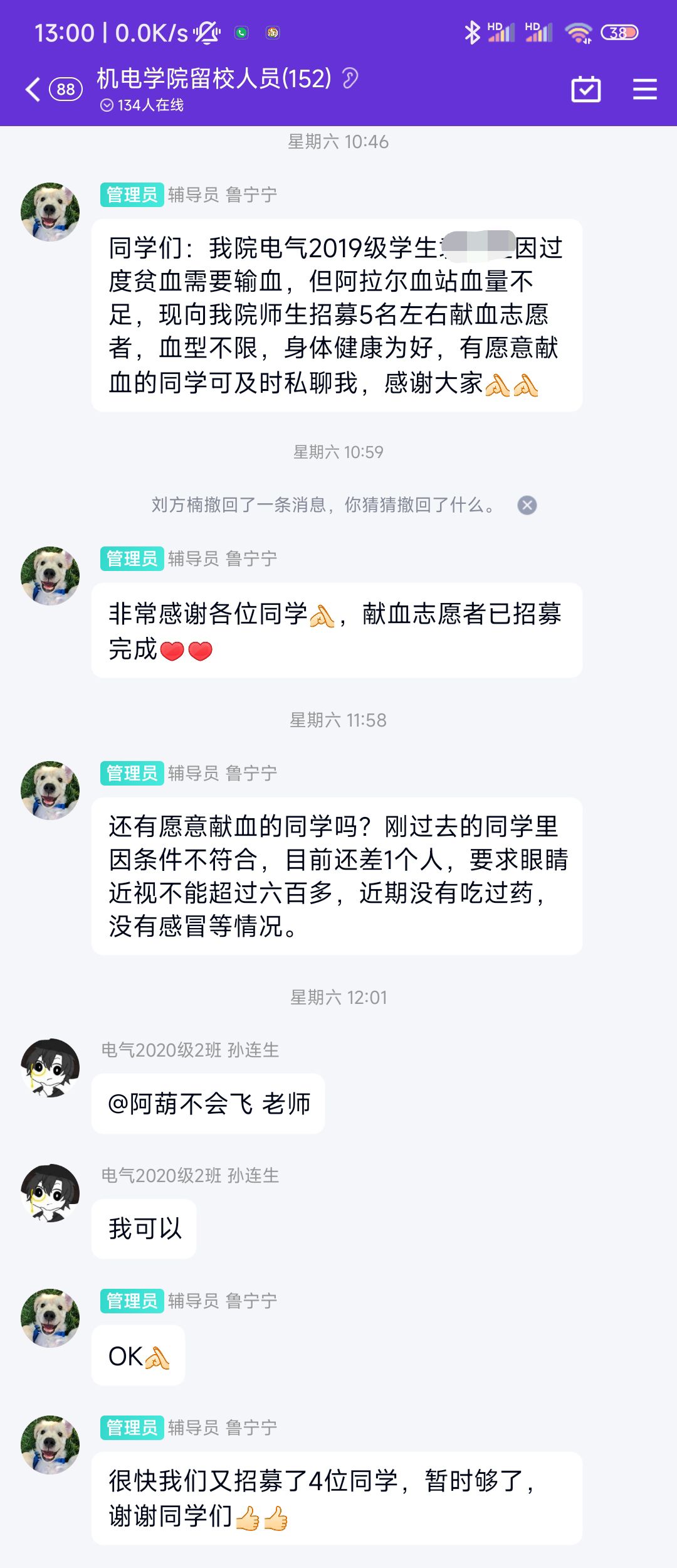 挂断电话后,马少辉便第一时间向学院做了汇报,学院及时响应并安排部署后续工作,辅导员立即在学院群中招募献血志愿者。