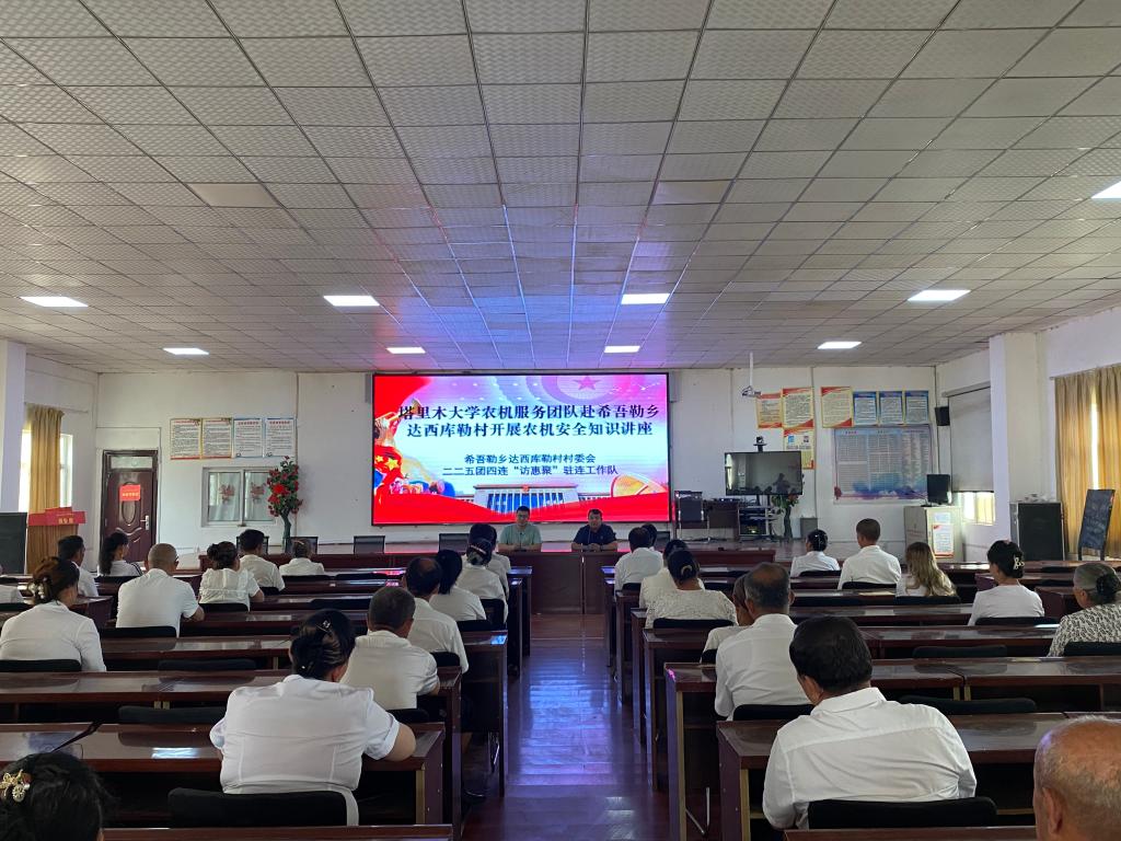 活动中,农机服务团队成员兰海鹏教授为达西库勒村村民进行农机方面的知识及使用安全的宣讲,现场耐心细致回答村民们提出的问题。