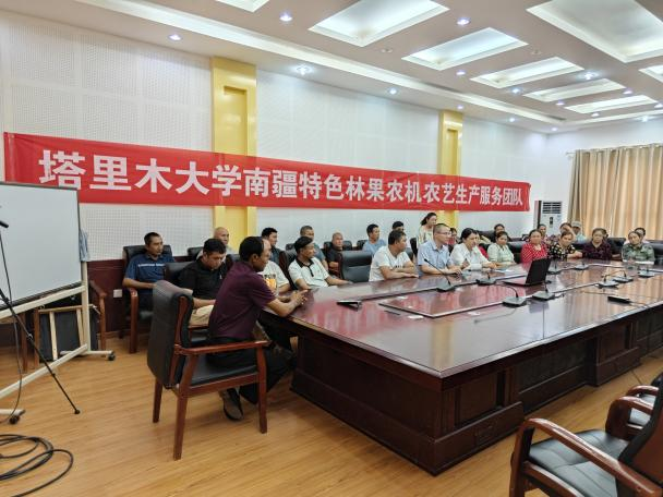 团队在十四师皮山农场农发中心吐泥沙古丽的协助翻译下,就新疆香梨、苹果、红枣等主要水果的种植规模和种植模式对当地农户进行了培训。主要包括品种选择、育苗及嫁接技术;林果肥水管理及不同树龄修剪技术;果树整形修剪、有害生物防治及林—饲间作一体化管理等技术培训。会议上村民们仔细聆听讲座,联系当下生产实际中遇到的问题进行了提问,团队成员针对农户提出的问题进行了热心讲解。