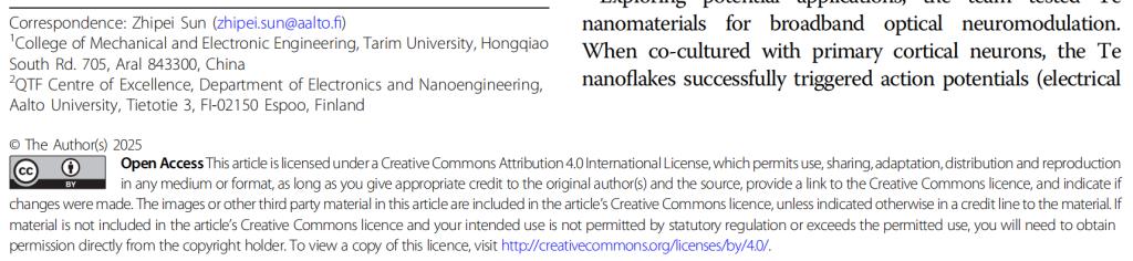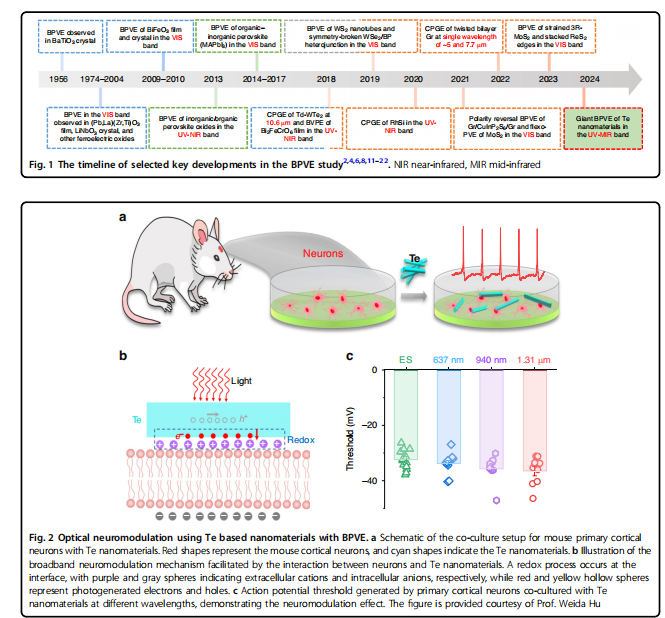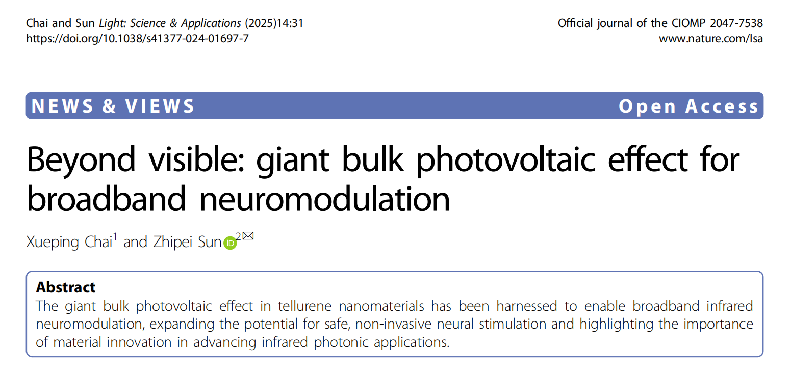柴学平为第一作者,芬兰阿尔托大学电子工程学院孙志培教授为通讯作者在国际光学和光子学领域期刊《Light: Science & Applications》(Nature子刊,IF=20.6)发表了题为《Beyond visible: giant bulk photovoltaic effect for broadband neuromodulation》的研究论文。