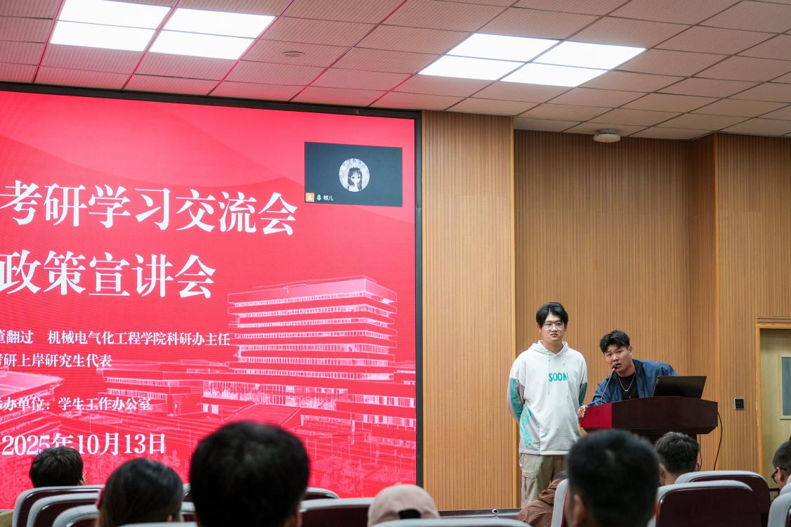 会上,董翻过详细解读了当前考研政策的最新变化,包括报考条件调整、复试流程优化、学院推免政策等方面,帮助学生们准确把握备考方向。随后,研究生代表们分享了自己的备考经历,从如何制定复习计划、应对备考压力,到专业课复习技巧、复试准备要点,都进行了细致讲解,并现场解答了同学们提出的关于目标院校确定、复习资料选择等问题,互动氛围热烈。