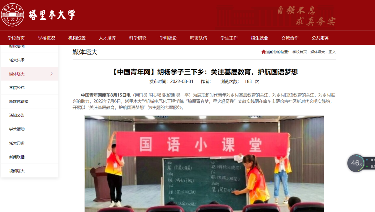 团委2022年暑期“三下乡”社会实践活动以“喜迎二十大,永远跟党走,奋进新征程”为主题,“按需设项”积极号召学生投身社会实践,组织开展党史学习教育、理论政策宣讲、红色记忆寻访、关怀教育帮扶、乡村振兴等实践活动,把党的关怀基层,把青年使命担当在肩,引领广大胡杨青年学生在社会实践中了解国情、增加阅历、磨炼意志。