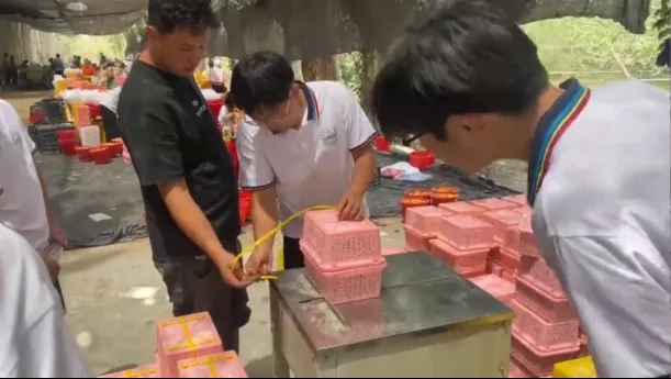 随后,在果园负责人指导下,队员们投入分拣打包工作:仔细剔除虫蛀和破损果实,用电子秤精准称重分级,按克重分为大中小果;再将杏果装入定制防震礼盒,确保每盒果形均匀、品质一致,最后快速完成密封打包。